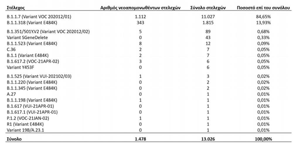 Από τον έλεγχο των 1.567 δειγμάτων, αναδείχθηκαν συνολικά 1.121 δείγματα με στελέχη ειδικού ενδιαφέροντος (Variants Of Concern – VOC) και 345 δείγματα με στελέχη υπό παρακολούθηση (Variants Under Monitoring). Εκ των 1.121 δειγμάτων με στελέχη ειδικού ενδιαφέροντος, τα 1.112 αφορούν στο Β.1.1.7 (Variant VOC 202012/01), 5 αφορούν στο B.1.351/501Y.V2 (Variant VOC 202012/02), 3 αφορούν στο B.1.617.2 (VOC-21APR-02) και 1 αφορά στο P.1.2 (VOC-21JAN-02). Εκ των 345 δειγμάτων με στελέχη υπό παρακολούθηση, τα 343 αφορούν στο στέλεχος B.1.1.318 (Variant E484K) και 2 αφορούν στο C.36.