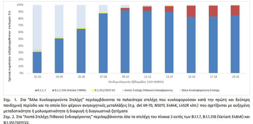 Μεταξύ των 13.931 τυχαία επιλεγμένων δειγμάτων στην επικράτεια, τα τρία πιο συχνά στελέχη ειδικού ενδιαφέροντος ή υπό διερεύνηση που έχουν απομονωθεί είναι το Β.1.1.7 (Variant VOC 202012/01), με ποσοστό 77,10%, ακολουθούμενο από το B.1.1.318 (Variant E484K) με ποσοστό 7,62% και το B.1.351/501Y.V2 (Variant VOC 202012/02) με ποσοστό 0,32%. Η διαχρονική εξέλιξη της σχετικής συχνότητας των αλληλουχηθέντων δειγμάτων από τυχαία δειγματοληψία ανά είδος στελεχών, μέχρι και την εβδομάδα 20 απεικονίζεται στο Διάγραμμα που ακολουθεί.