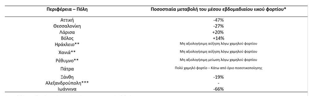 Καθαρά πτωτικές μεταβολές παρατηρήθηκαν στα Ιωάννινα (-66%) και στην Περιφέρεια Αττικής (-47%), ενώ οριακές ήταν οι μειώσεις στη Θεσσαλονίκη (-27%) και στην Ξάνθη (-19%). Οριακές αυξήσεις παρατηρήθηκαν στο ιικό φορτίο των αστικών λυμάτων στο Βόλο (+14%) και στη Λάρισα (+20%).