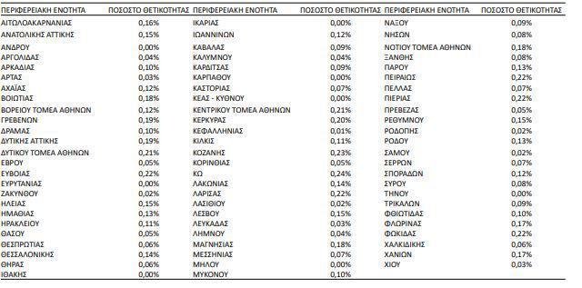 Βάσει αυτών, ο πίνακας που καταγράφει τον δείκτη θετικότητας ανά περιοχή, σύμφωνα με τον ΕΟΔΥ, είναι ο εξής:
