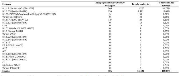 Εκ των 326 δειγμάτων με στελέχη ειδικού ενδιαφέροντος, τα 305 αφορούν στο Β.1.1.7 (Variant VOC 202012/01), 3 αφορούν στο B.1.351/501Y.V2 (Variant VOC 202012/02) και 18 αφορούν στο B.1.617.2 (VOC-21APR-02). Εκ των 155 δειγμάτων με στελέχη υπό παρακολούθηση και τα 155 αφορούν στο στέλεχος B.1.1.318 (Variant E484K).