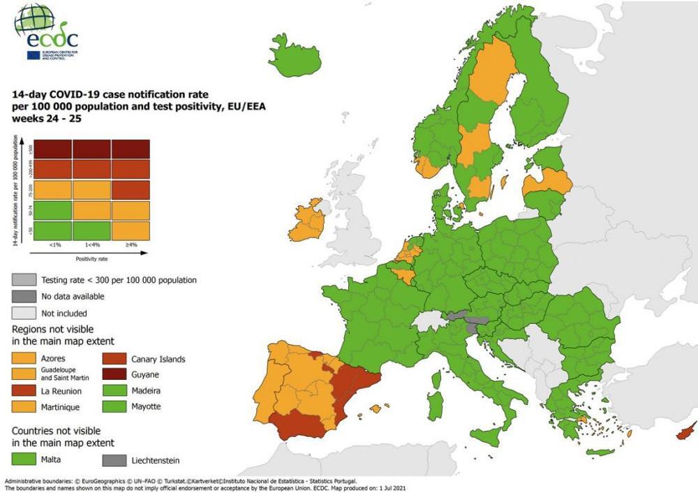 Συγκεκριμένα, η Αττική, οι Κυκλάδες και τα Δωδεκάνησα είναι «πορτοκαλί», με βάση τα κρούσματα ανά 100.000 κατοίκους και τον αριθμό των τεστ που διενεργούνται.