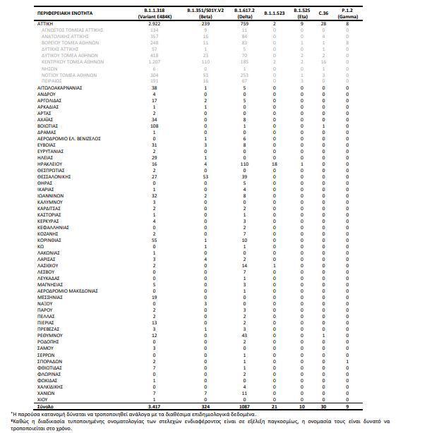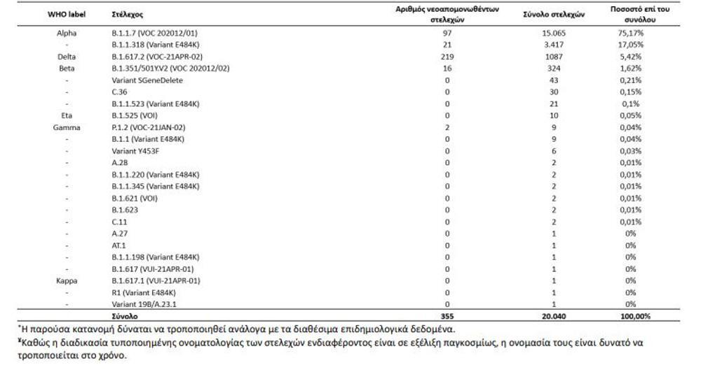 Εκ των 334 δειγμάτων με στελέχη ειδικού ενδιαφέροντος, τα 219 αφορούν στο στέλεχος Delta, 97 αφορούν στο Alpha, 16 αφορούν στο Βeta και 2 αφορούν στο Gamma. Εκ των 21 δειγμάτων με στελέχη υπό παρακολούθηση, όλα αφορούν στο στέλεχος B.1.1.318 (Variant E484K).