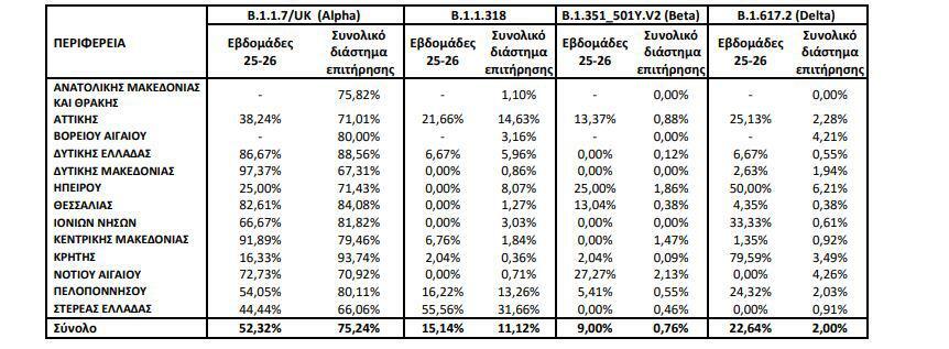 Από τα δείγματα αυτά, 49,11% αφορούν στο B.1.1.318 (Variant E484K), 21,23% στο Delta, 16,41% στο Alpha, 6,84% στο Beta, 0,15% στο C.36 και 0,11% στο Gamma.