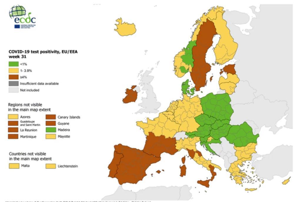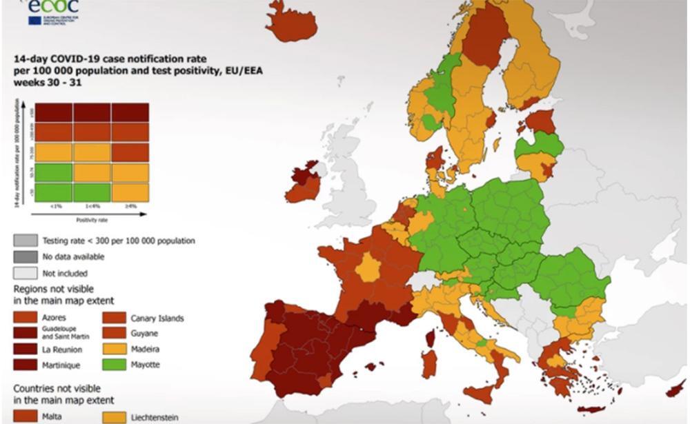 Το παραπάνω αποτυπώνεται και στους χάρτες που δημοσιεύει σήμερα Πέμπτη (12/8) το ECDC (Ευρωπαϊκό Κέντρο Πρόληψης και Ελέγχου Νόσων).