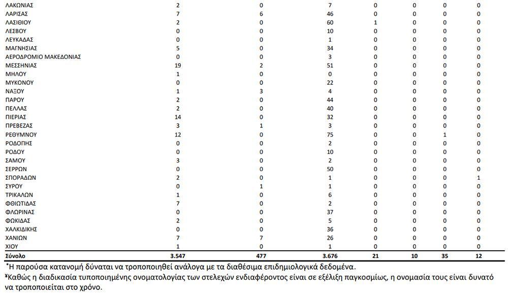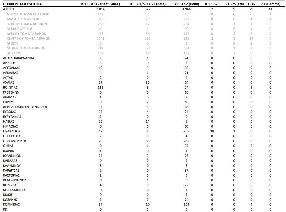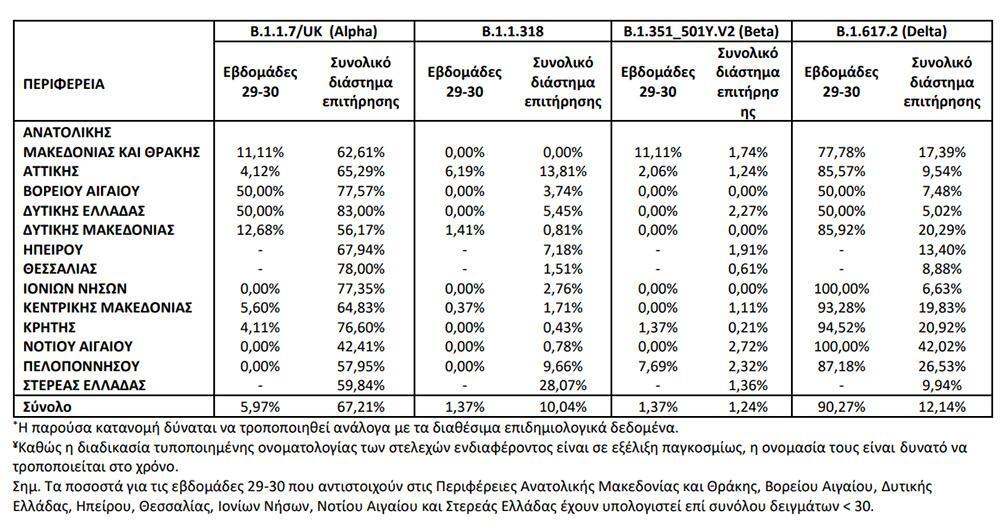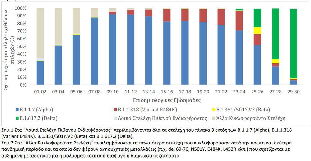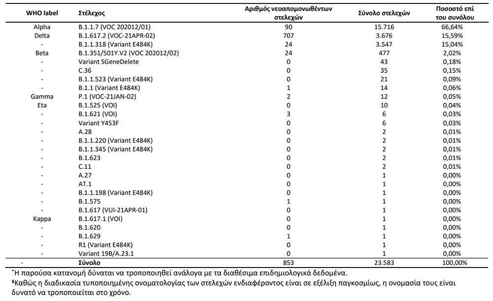 Εκ των 823 δειγμάτων με στελέχη ειδικού ενδιαφέροντος, τα 707 αφορούν στο στέλεχος Delta, 90 αφορούν στο Alpha, 24 αφορούν στο Βeta και 2 αφορούν στο Gamma. Εκ των 24 δειγμάτων με στελέχη υπό παρακολούθηση, όλα αφορούν στο στέλεχος B.1.1.318 (Variant E484K). Εκ των 3 δειγμάτων με στελέχη ενδιαφέροντος, όλα αφορούν στο B.1.621 (VOI). Επιπλέον ανιχνεύθηκαν, 1 στέλεχος B.1.629, 1 στέλεχος B.1.575 και 1 στέλεχος Β.1.1 (Variant E484K).