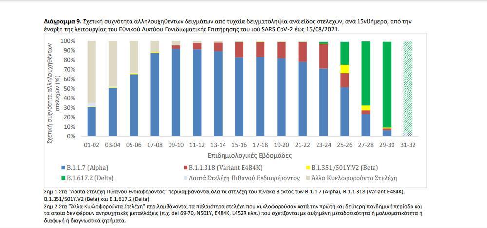 Η διαχρονική εξέλιξη της σχετικής συχνότητας των αλληλουχηθέντων δειγμάτων από τυχαία δειγματοληψία ανά είδος στελεχών, μέχρι και την εβδομάδα 30 απεικονίζεται στο Διάγραμμα 9, ενώ δίνονται επιπλέον προσωρινά στοιχεία για τις εβδομάδες 31-32.