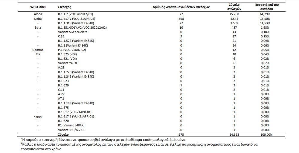 Από τα 3.002 δείγματα που έχουν ληφθεί ή επιλεγεί στοχευμένα, έχουν βρεθεί 2.839 στελέχη ειδικού ενδιαφέροντος ή υπό παρακολούθηση. Από τα δείγματα αυτά, 43,64% αφορούν στο B.1.1.318 (Variant E484K), 28,21% στο Delta, 15,79% στο Alpha, 6,70% στο Beta, 0,13% στο C.36 και 0,10% στο Gamma.