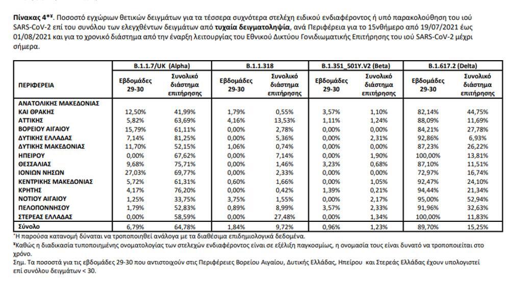 Εκ των 950 δειγμάτων με στελέχη ειδικού ενδιαφέροντος, τα 868 αφορούν στο στέλεχος Delta, 72 αφορούν στο Alpha και 10 αφορούν στο Βeta. Εκ των 24 δειγμάτων με στελέχη υπό παρακολούθηση, τα 22 αφορούν στο στέλεχος B.1.1.318 (Variant E484K) και 2 αφορούν στο C.36. Επιπλέον ανιχνεύθηκε, 1 στέλεχος B.1.629 (Πίνακας 3).