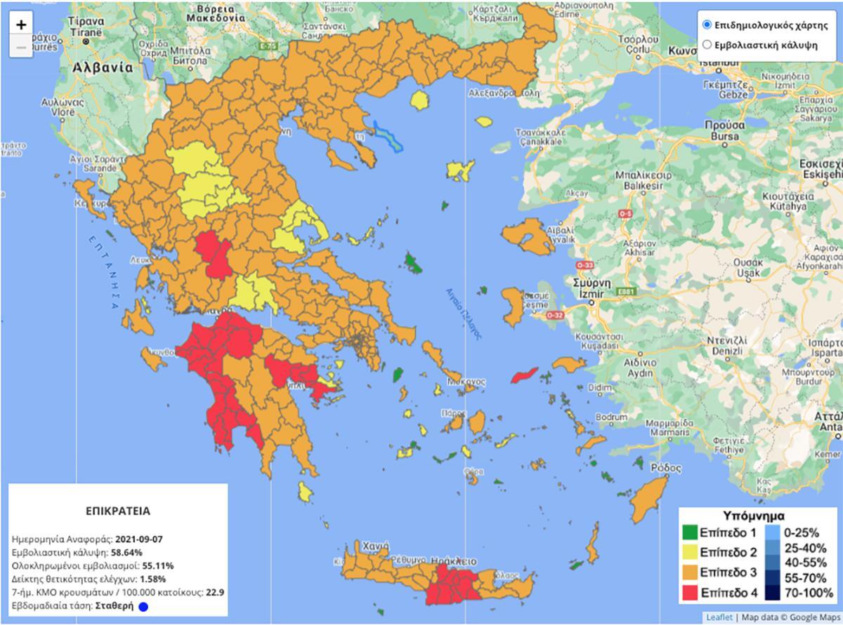 Θυμίζουμε ότι στο κόκκινο παραμένουν το Ηράκλειο, η Ικαρία, η Μεσσηνία, η Αχαΐα, η Ηλεία. Για τις κόκκινες περιοχές, προβλέπεται απαγόρευση κυκλοφορίας από 01:00 το βράδυ έως 06:00 το πρωί, καθώς και απαγόρευση μουσικής καθ’ όλο το εικοσιτετράωρο σε καταστήματα υγειονομικού ενδιαφέροντος και ψυχαγωγίας.