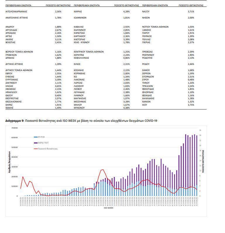 Σύμφωνα με τα νεότερα στοιχεία του ΕΟΔΥ η θετικότητα στην Ηλεία ανέρχεται στο 4,65%, ενώ σε 4,38% και τα 4,28% υπολογίζεται το ιικό φορτίο σε Μύκονο και Ικαρία αντίστοιχα.