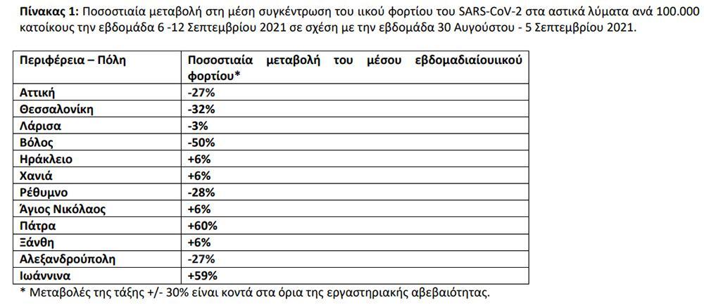 Οι καθαρά αυξητικές τάσεις παρατηρήθηκαν στην Πάτρα (+60%) και στα Ιωάννινα (+59%). Σταθερό παρέμεινε το ιικό φορτίο των αστικών λυμάτων στη Λάρισα, στο Ηράκλειο, στα Χανιά, στον Άγιο Νικόλαο και στην Ξάνθη, όπου οι μεταβολές στο μέσο εβδομαδιαίο ιικό φορτίο κυμάνθηκαν από -3% έως +6%. Πτωτικές τάσεις στο ιικό φορτίο των αστικών λυμάτων παρατηρήθηκαν σε πέντε από τις δώδεκα (5/12) περιοχές που ελέγχθηκαν από το Εθνικό Δίκτυο Επιδημιολογίας Λυμάτων του ΕΟΔΥ. Καθαρά πτωτική τάση παρατηρήθηκε στο Βόλο (-50%), ενώ οριακές ήταν οι μειώσεις στη Θεσσαλονίκη (-32%), στο Ρέθυμνο (-28%), στην Αλεξανδρούπολη (-27%) και στην Αττική (-27%).