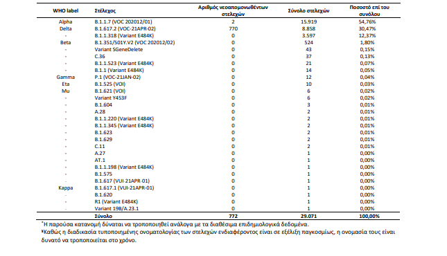 Εκ των 772 δειγμάτων με στελέχη ειδικού ενδιαφέροντος, τα 770 αφορούν στο στέλεχος Delta και 2 αφορούν στο Alpha.