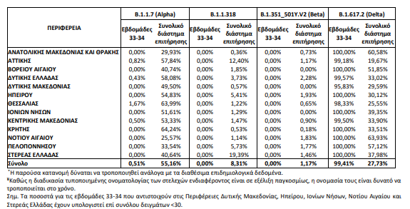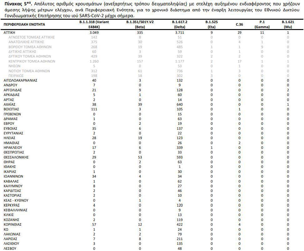 Από τα δείγματα αυτά, 42,66% αφορούν στο B.1.1.318 (Variant E484K), 29,73% στο Delta, 15,50% στο Alpha, 6,55% στο Beta, 0,13% στο C.36 και 0,10% στο Gamma.