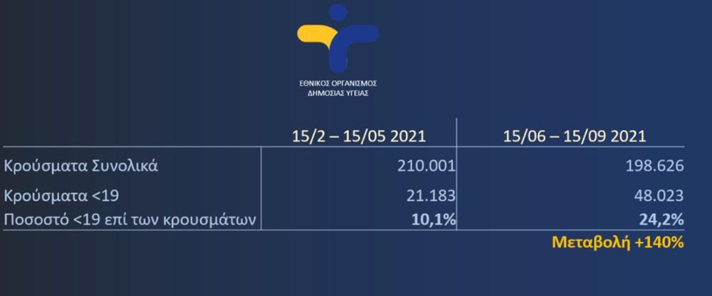 Είναι χαρακτηριστικό ότι μεταξύ 15/6/2021 και 15/9/2021, δηλαδή τους καλοκαιρινούς μήνες, όταν τα σχολεία ήταν κλειστά, ο αριθμός κρουσμάτων σε νέους κάτω των 19 ετών αυξήθηκε από 238 κρούσματα την ημέρα κατά μέσο όρο (15/2/21-15/5/21) σε 522 κρούσματα την ημέρα κατά μέσο όρο (15/6/21-15/9/21), δηλαδή υπερδιπλασιάστηκε. Αντίστοιχα, το ποσοστό των συνολικών κρουσμάτων COVID-19 που αντιστοιχούσε σε νέους κάτω των 19 ετών αυξήθηκε από 10.1% (15/02/21-15/5/21) σε 24.2% (15/06/21-15/9/21) (βλ. τον παρακάτω πίνακα).