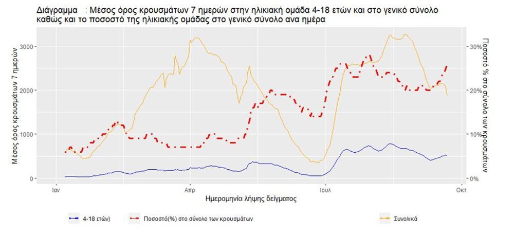 Την εβδομάδα αναφοράς, το σύνολο των ασθενών ηλικίας 4-18 ετών είναι 3.559, αποτελώντας το 24% (+14% από την προηγούμενη εβδομάδα) στο σύνολο των κρουσμάτων (Iso Week 37).