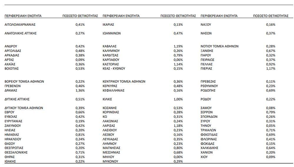 Συγκεκριμένα, το υψηλότερο ποσοστό ανάμεσα στις περιοχές εντοπίζεται στην Δράμα με θετικότητα 1,36% και ακολουθεί η Καβάλα με 1,19% .