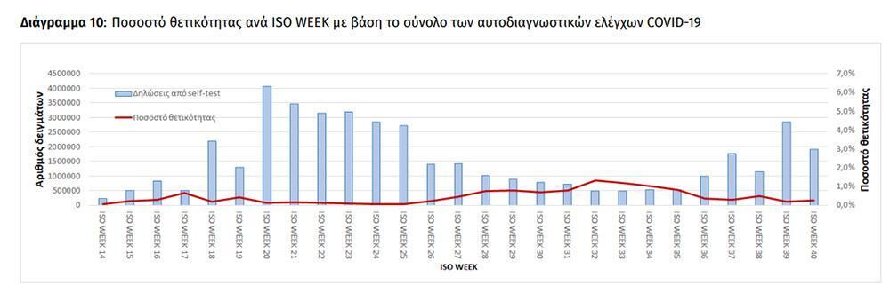 Συγκεκριμένα, όπως σημειώνεται στην ενημέρωση, την προηγούμενη εβδομάδα, το ποσοστό θετικότητας ήταν 1.17% σε σύνολο 1.303.844 εργαστηριακών ελέγχων (RT-PCR/Rapid-Ag) και 0.25% σε σύνολο 1.911.382 αυτοδιαγνωστικών ελέγχων. Στο σύνολο των ελέγχων, το ποσοστό θετικότητας ήταν 0.48%.