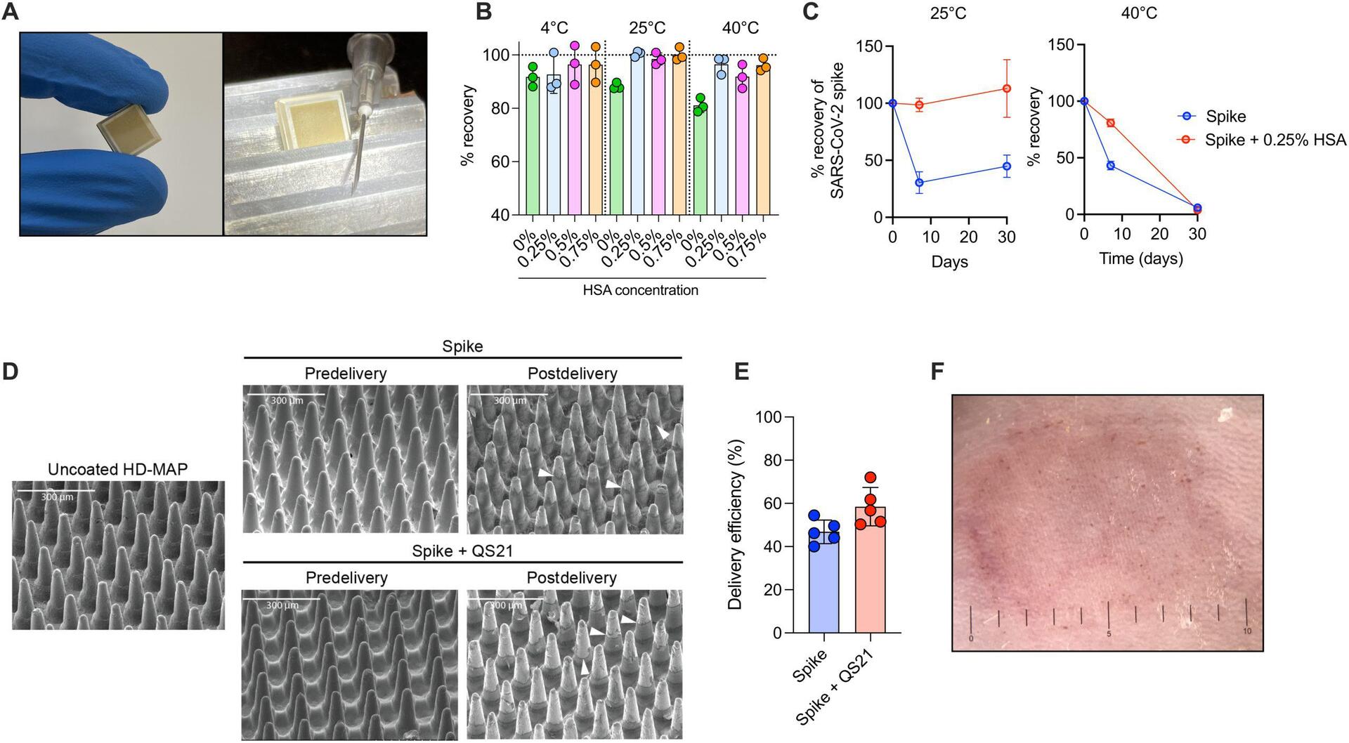 Οι ερευνητές δοκίμασαν το επίθεμα με ένα υποψήφιο εμβόλιο Covid-19, το HexaPro του Πανεπιστημίου του Τέξας, το οποίο βρίσκεται σε φάση κλινικών δοκιμών. Τα τρωκτικά, στα οποία έγινε το εμβόλιο μέσω του επιθέματος, ανέπτυξαν περισσότερα αντισώματα σε σχέση με εκείνα που έκαναν το εμβόλιο με ένεση. Το εμβόλιο HexaPro παρέμεινε σταθερό για τουλάχιστον έναν μήνα στο επίθεμα όταν αποθηκεύτηκε σε θερμοκρασία 25 βαθμών Κελσίου και για μία εβδομάδα όταν η θερμοκρασία συντήρησής του ήταν οι 40 βαθμοί.