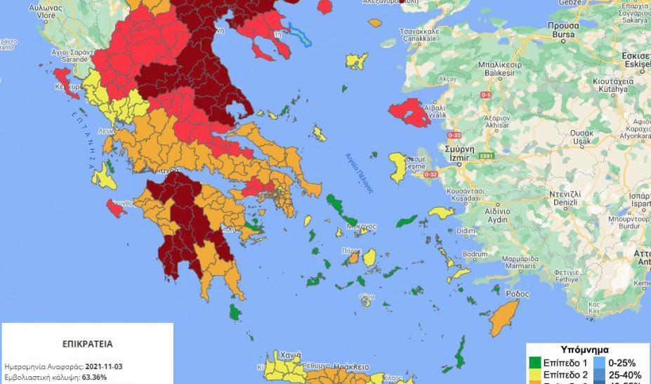 Στο κόκκινο είναι 22 περιοχές:Θεσσαλονίκη, Αρκαδία, Αγιον Ορος, Αχαΐα, Λάρισα, Μαγνησία, Κιλκίς, Ημαθία, Πιερία, Εβρος, Πέλλα, Ξάνθη, Δράμα, Μεσσηνία, Σέρρες, Τρίκαλα, Καβάλα, Κοζάνη, Καρδίτσα,