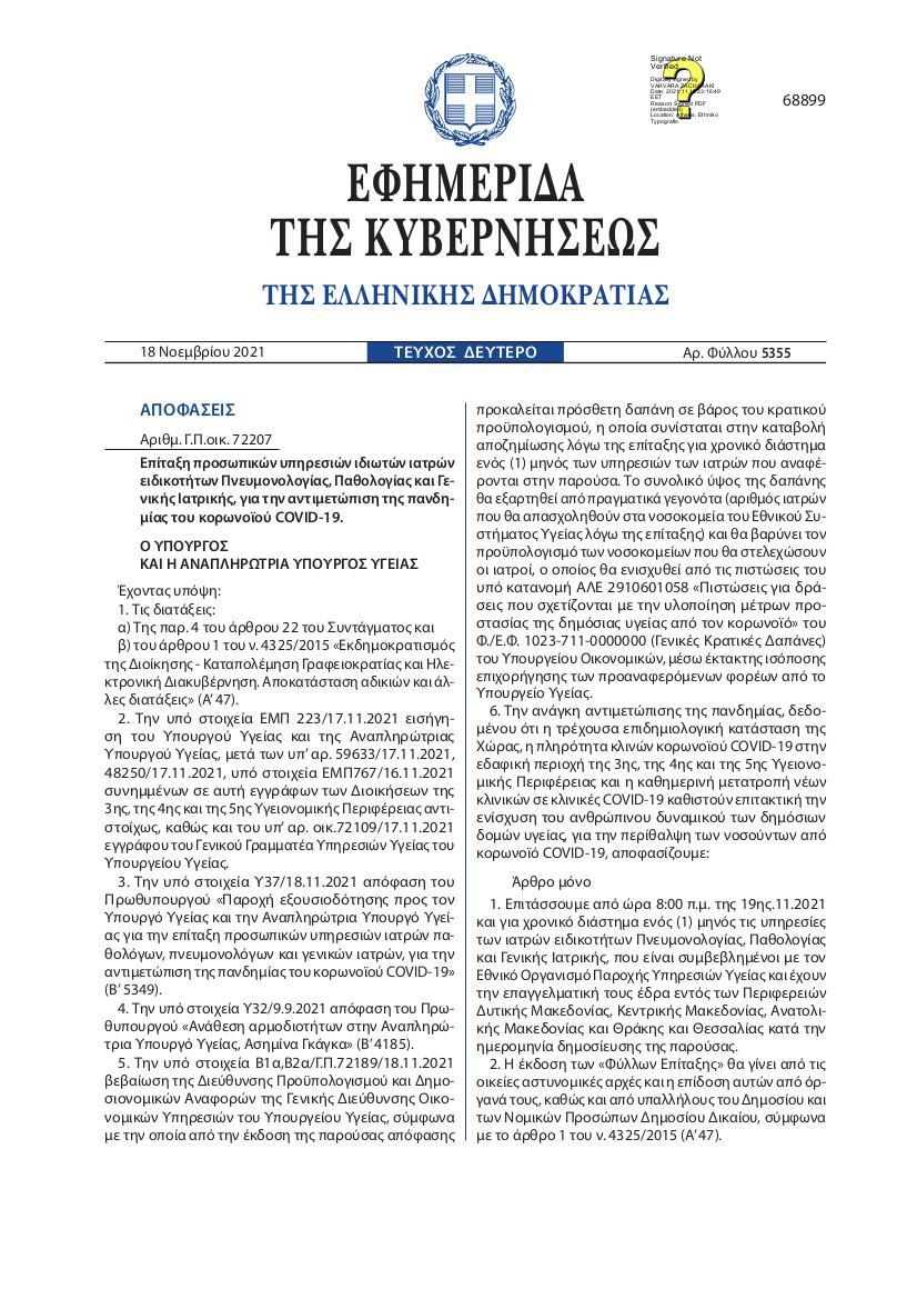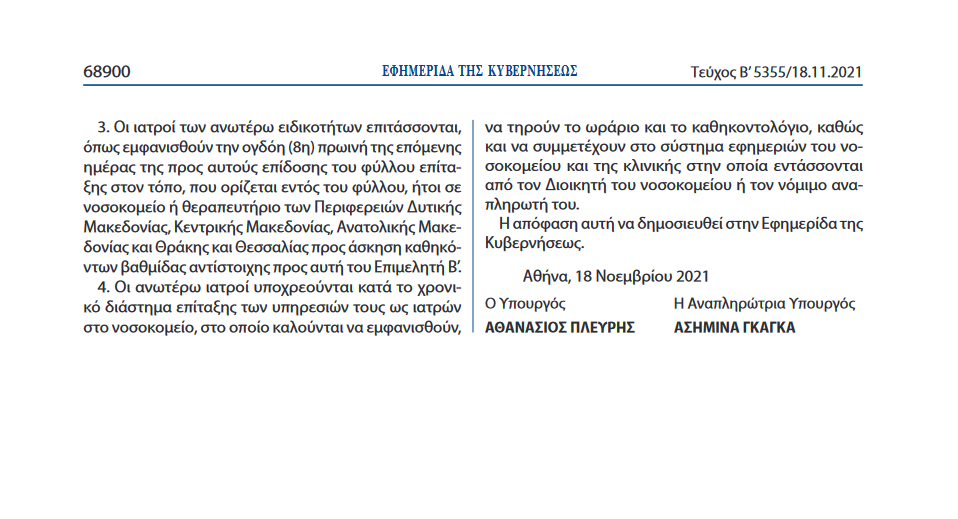 «Επιτάσσουμε από ώρα 8:00 π.μ. της 19ης.11.2021 και για χρονικό διάστημα ενός (1) μηνός τις υπηρεσίες των ιατρών ειδικοτήτων Πνευμονολογίας, Παθολογίας και Γενικής Ιατρικής, που είναι συμβεβλημένοι με τον Εθνικό Οργανισμό Παροχής Υπηρεσιών Υγείας και έχουν την επαγγελματική τους έδρα εντός των Περιφερειών Δυτικής Μακεδονίας, Κεντρικής Μακεδονίας, Ανατολικής Μακεδονίας και Θράκης και Θεσσαλίας κατά την ημερομηνία δημοσίευσης της παρούσας.