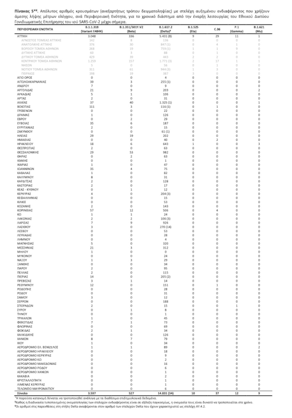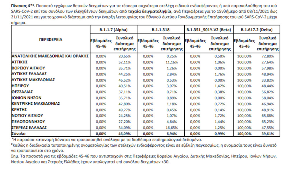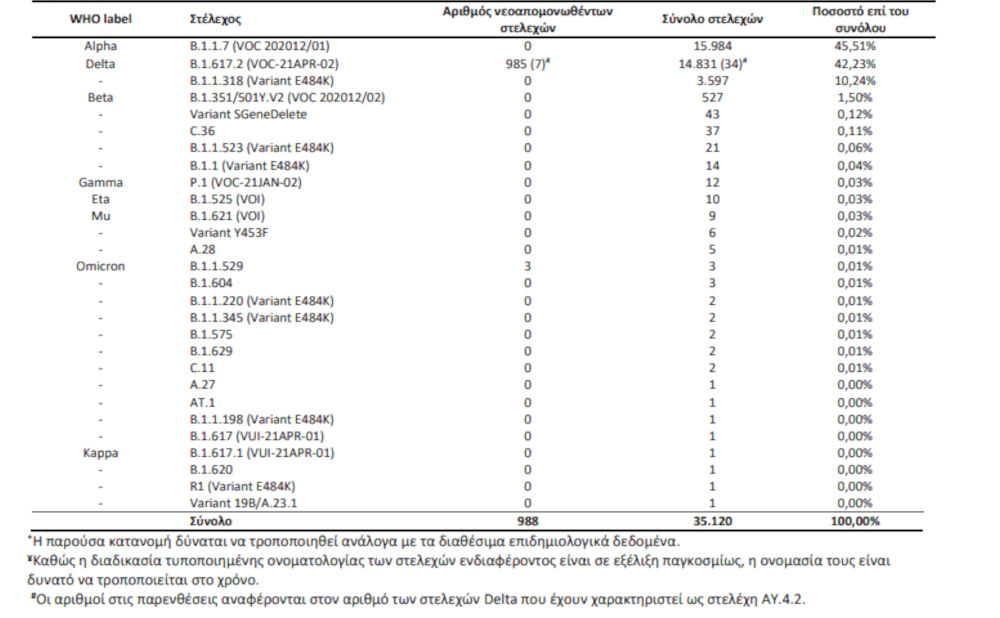 Εκ των 988 δειγμάτων με στελέχη ειδικού ενδιαφέροντος, τα 985 αφορούν στο στέλεχος Delta, και 3 αφορούν στο Omicron (Πίνακας 3). Επτά εκ των 985 στελεχών Delta αφορούν στο στέλεχος AY.4.2, τα οποία εντοπίστηκαν στις Περιφερειακές Ενότητες του Λασιθίου (5), της Βοιωτίας (1) και του Νοτίου Τομέα Αθηνών (1). Τα τρία στελέχη Omicron εντοπίστηκαν σε δύο εισαγόμενα κρούσματα στις Περιφερειακές Ενότητες του Κεντρικού Τομέα Αθηνών και των Χανίων και σε ένα εγχώριο κρούσμα στην Περιφερειακή ενότητα του Κεντρικού Τομέα Αθηνών.