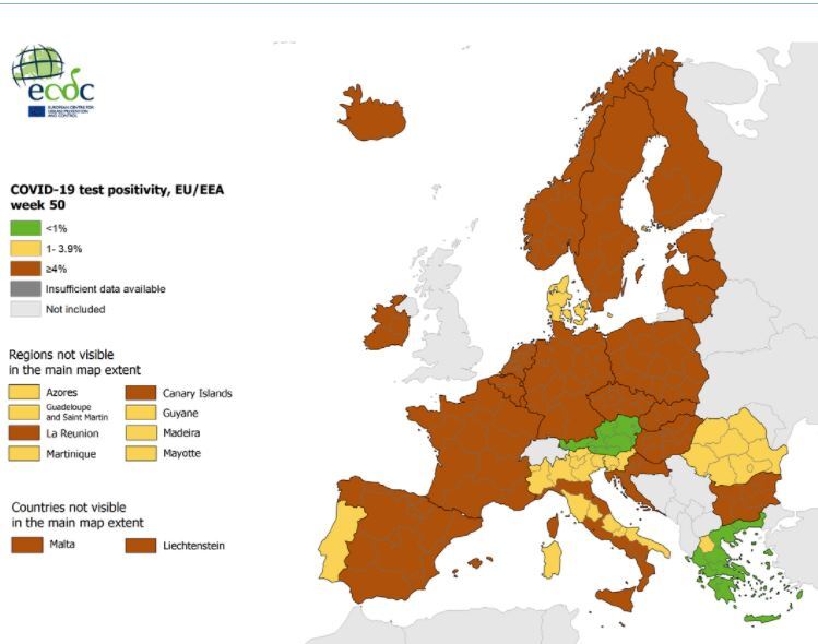 Στις «πράσινες» αποχρώσεις εμφανίζεται η χώρα μας στο δείκτη που αφορά τον αριθμό τεστ που διενεργούνται, ενώ το μεγαλύτερο μέρος της χώρας «πρασινίζει» επίσης στο δείκτη που αφορά τη θετικότητα- με εξαίρεση ορισμένες περιοχές της Βόρειας Ελλάδας που εντάσσονται στο «κίτρινο».
