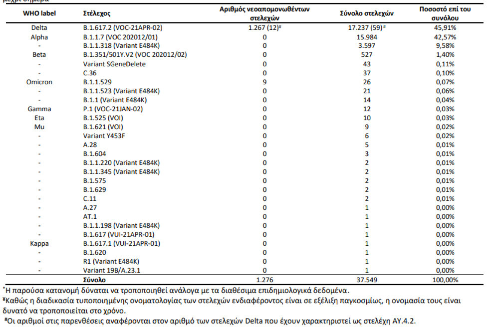 Εκ των 1.276 δειγμάτων με στελέχη ειδικού ενδιαφέροντος, τα 1.267 αφορούν στο στέλεχος Delta, και 9 αφορούν στο Omicron. Δώδεκα (12) εκ των 1.267 στελεχών Delta αφορούν στο στέλεχος AY.4.2, τα οποία εντοπίστηκαν σε έντεκα εγχώρια κρούσματα στις