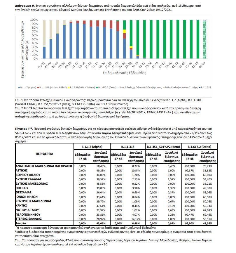Μεταξύ των 36.155 τυχαία επιλεγμένων δειγμάτων στην επικράτεια, τα τέσσερα πιο συχνά στελέχη ειδικού ενδιαφέροντος ή υπό παρακολούθηση που έχουν απομονωθεί είναι το Delta, με ποσοστό 43,56%, ακολουθούμενο από το Alpha, με ποσοστό 43,05%, το B.1.1.318 (Variant E484K) με ποσοστό 6,48%, και το Beta με ποσοστό 0,92%. Η διαχρονική εξέλιξη της σχετικής συχνότητας των αλληλουχηθέντων δειγμάτων από τυχαία δειγματοληψία ανά είδος στελεχών, μέχρι και την εβδομάδα 48 απεικονίζεται στο Διάγραμμα 9, ενώ δίνονται επιπλέον προσωρινά στοιχεία για τις εβδομάδες 49-50.
