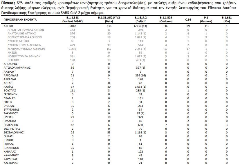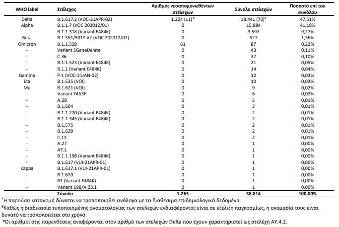 Από τον έλεγχο των 1.301 δειγμάτων, αναδείχθηκαν συνολικά 1.265 δείγματα με στελέχη ειδικού ενδιαφέροντος (Variants Of Concern – VOC). Εκ των 1.265 δειγμάτων με στελέχη ειδικού ενδιαφέροντος, τα 1.204 αφορούν στο στέλεχος Delta και 61 αφορούν στην μετάλλαξη Όμικρον.