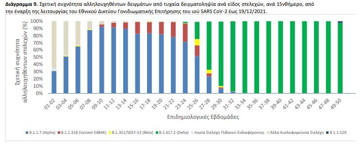 Μεταξύ των 37.398 τυχαία επιλεγμένων δειγμάτων στην επικράτεια, τα τέσσερα πιο συχνά στελέχη ειδικού ενδιαφέροντος ή υπό παρακολούθηση που έχουν απομονωθεί είναι το Delta με ποσοστό 45,35%, ακολουθούμενο από το Alpha με ποσοστό 41,62%, το B.1.1.318 (Variant E484K) με ποσοστό 6,27%, και το Beta με ποσοστό 0,89%. Η διαχρονική εξέλιξη της σχετικής συχνότητας των αλληλουχηθέντων δειγμάτων από τυχαία δειγματοληψία ανά είδος στελεχών, μέχρι και την εβδομάδα 50.
