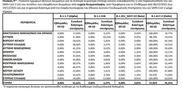 Ποσοστό εγχώριων θετικών δειγμάτων για τα τέσσερα συχνότερα στελέχη ειδικού ενδιαφέροντος ή υπό παρακολούθηση του ιού SARS-CoV-2 επί του συνόλου των ελεγχθέντων δειγμάτων από τυχαία δειγματοληψία, ανά Περιφέρεια για το 15νθήμερο από 06/12/2021 έως 19/12/2021 και για το χρονικό διάστημα από την έναρξη λειτουργίας του Εθνικού Δικτύου Γονιδιωματικής Επιτήρησης του ιού SARS-CoV-2 μέχρι σήμερα
