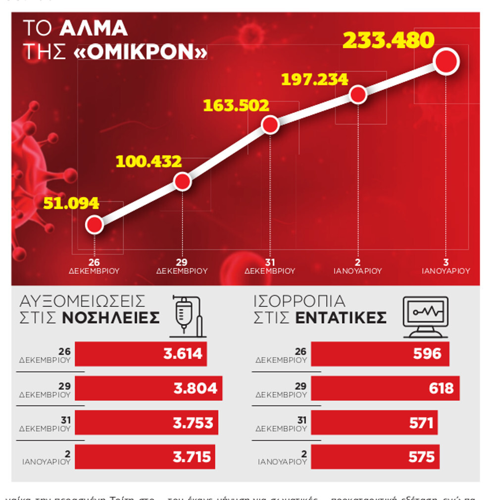 Την επόμενη ημέρα των Χριστουγέννων, στις 26 Δεκεμβρίου, τα ενεργά κρούσματα σε όλη τη χώρα ήταν 51.094, και από εκεί και έπειτα ξεκινά ο αγωνιώδης… ανήφορος. Την επόμενη μέρα τα κρούσματα ήταν 55.803, στις 29 Δεκεμβρίου αυτά σχεδόν διπλασιάστηκαν και έφθασαν τα 100.432, την παραμονή Πρωτοχρονιάς έγιναν 163.502 και στις 2 Ιανουαρίου 197.234, στα οποία χθες προστέθηκαν επιπλέον 36.246, ανεβάζοντας τον σχετικό αριθμό στα 233.480 ενεργά κρούσματα.