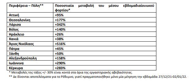 Λάρισα: Την τελευταία εβδομάδα, 27/12/21-02/01/2022, το μέσο εβδομαδιαίο ιικό φορτίο των αστικών λυμάτων στη Λάρισα παρουσίασε αλματώδη αύξηση (+342%) σε σχέση με την εβδομάδα 20-26/12/21.