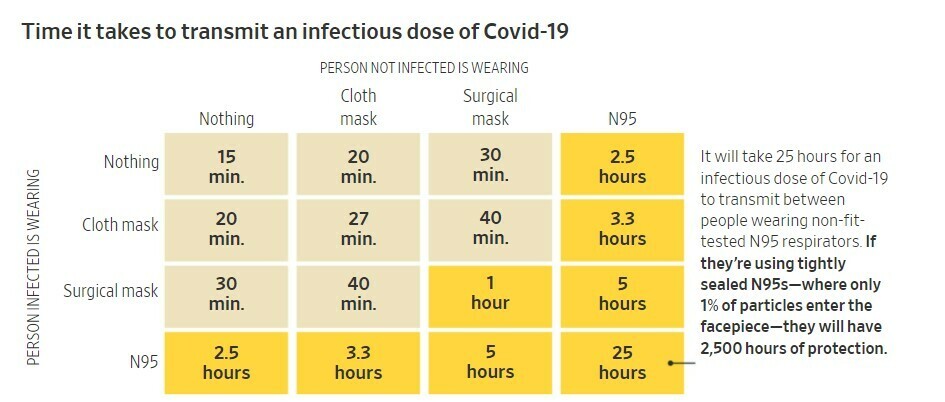 Σε μια γραφική παράσταση της προστασίας που προσφέρει η κάθε μάσκα, η αμερικανική εφημερίδα «Wall Street Journal» (WSJ) καταγράφει πόση ώρα χρειάζεται για να μεταδοθεί ο ιός αν δύο πρόσωπα φορούν μάσκες διαφόρων τύπων και ο ένας εκ των δύο νοσεί από Covid. Οπως φαίνεται στο γράφημα, θα χρειαστούν πολλές ώρες αλληλεπίδρασης για να μεταδοθεί ο ιός μεταξύ δύο προσώπων, αν φορούν σωστά τη μάσκα υψηλής προστασίας. Οι ειδικοί σημειώνουν ότι οποιαδήποτε μάσκα κι αν φορά κανείς πρέπει να εφαρμόζεται σωστά στο πρόσωπο -να σφραγίζει τη μύτη και το στόμα- ώστε να είναι αποτελεσματική.