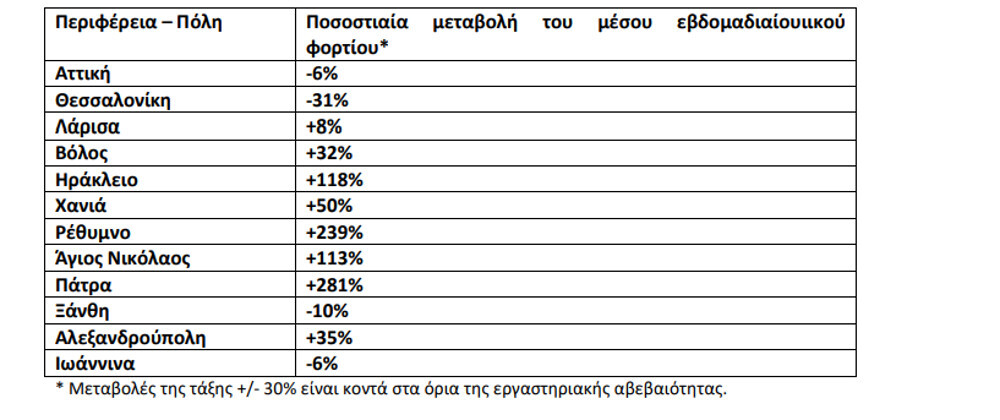 Οι καθαρά αυξητικές τάσεις κυμάνθηκαν από +32% στο Βόλο μέχρι +281% στην Πάτρα. Το ιικό φορτίο των αστικών λυμάτων παρέμεινε σταθερό στη Λάρισα (+8%), στην Ξάνθη (-10%), στα Ιωάννινα (-6%) και στην Περιφέρεια Αττικής (-6%). Μείωση στο ιικό φορτίο των αστικών λυμάτων παρατηρήθηκε στη Θεσσαλονίκη (-31%).