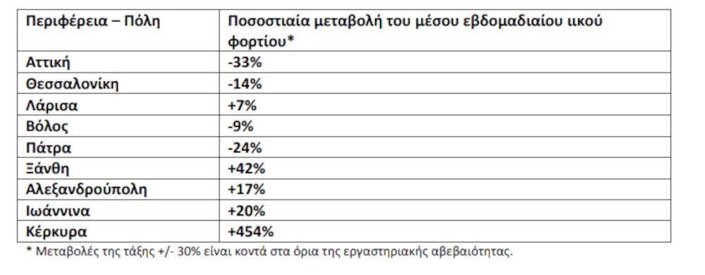 Πίνακας 1: Ποσοστιαία μεταβολή στη μέση συγκέντρωση του ιικού φορτίου του SARS-CoV-2 στα αστικά λύματα ανά 100.000 κατοίκους την εβδομάδα 07-13/02/22 σε σχέση με την εβδομάδα 31/01-06/02/22.