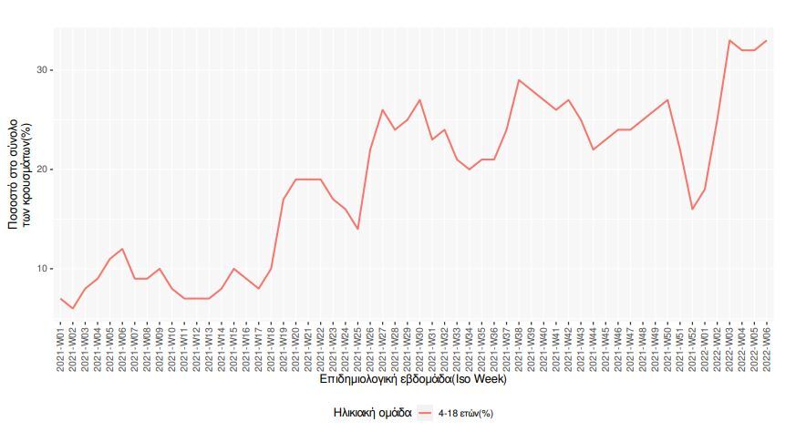 Συγκεκριμένα, την εβδομάδα αναφοράς (07 Φεβρουαρίου 2022 – 13 Φεβρουαρίου 2022), το σύνολο των ασθενών ηλικίας 4-18 ετών είναι 41.489, αποτελώντας το 33% (3% από την προηγούμενη εβδομάδα) στο σύνολο των κρουσμάτων.
