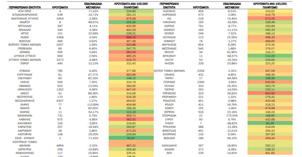 Στον πίνακα παρουσιάζεται τo σύνολο των κρουσμάτων, η επίπτωση ανά 100.000 πληθυσμού καθώς και η εβδομαδιαία μεταβολή των επιβεβαιωμένων κρουσμάτων COVID-19 ανά περιφερειακή ενότητα την εβδομάδα αναφοράς σε σύγκριση με την προηγούμενη εβδομάδα.