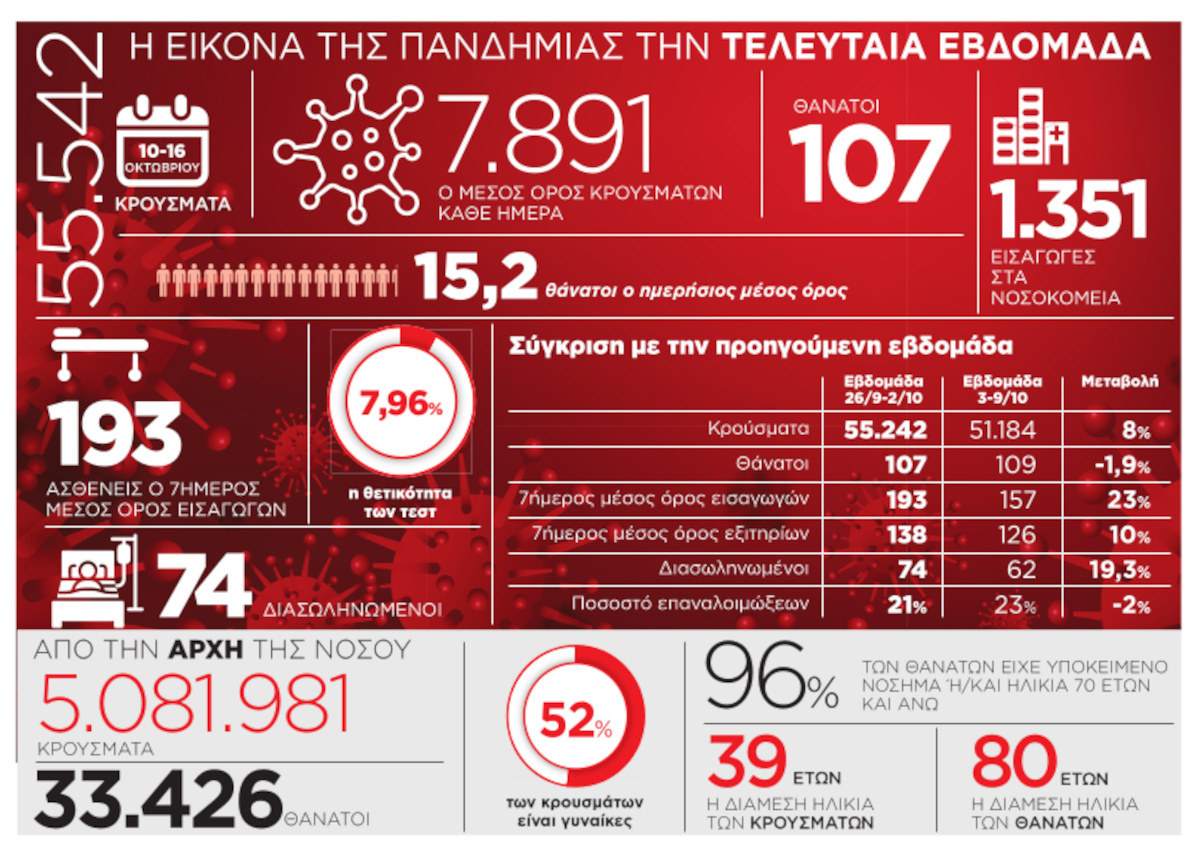 Πιο αναλυτικά, σύμφωνα με τη χθεσινή επιδημιολογική έκθεση του ΕΟΔΥ, την εβδομάδα 10-16 Οκτωβρίου καταγράφηκαν 55.242 κρούσματα, αριθμός αυξημένος κατά 8% σε σύγκριση με την προηγούμενη εβδομάδα. Οι θάνατοι κινούνται περίπου στο ίδιο επίπεδο (107 έναντι 109 την περασμένη εβδομάδα), ωστόσο άνοδο παρουσιάζουν οι νοσηλείες. Συνολικά για την εβδομάδα που πέρασε, έγιναν 1.351 εισαγωγές στα νοσοκομεία, με τον επταήμερο μέσο όρο να διαμορφώνεται σε 193 ασθενείς έναντι 157 την περασμένη εβδομάδα – αύξηση κατά 23%. Επιπλέον, αυξήθηκαν και οι διασωληνωμένοι, αφού από 62 ασθενείς πλέον νοσηλεύονται με μηχανική υποστήριξη της αναπνοής τους 74.