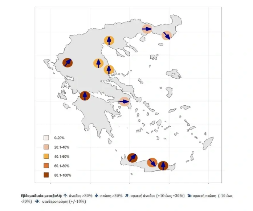 Παράλληλα, πτωτικές τάσεις παρατηρήθηκαν σε τρεις από τις δώδεκα (3/12) περιοχές και σταθεροποίηση σε δύο από τις δώδεκα (2/12) περιοχές του ΕΔΕΛ.