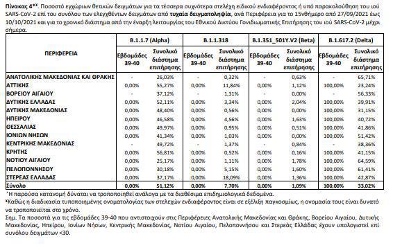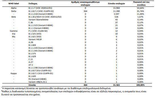 Από τα δείγματα αυτά, 39,60% αφορούν στο B.1.1.318 (Variant E484K), 32,65% στο Delta, 16,29% στο Alpha, 6,11% στο Beta, 0,12% στο C.36, 0,09% στο Gamma, 0,09% στο Eta και 0,09% στο A.28.