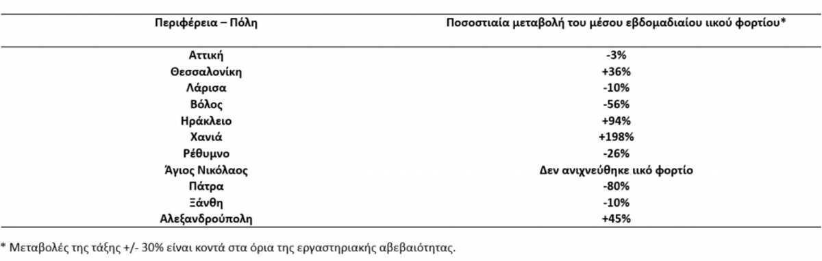 Kαθαρά πτωτικές μεταβολές παρατηρήθηκαν στην Πάτρα (-80%) και στο Βόλο (-56%), ενώ οριακά πτωτικές παρουσιάστηκαν οι μεταβολές στο Ρέθυμνο (-26%) καθώς και στη Λάρισα (-10%) και στην Ξάνθη (-10%). Σταθερό παρέμεινε ουσιαστικά το ιικό φορτίο στην Περιφέρεια Αττικής, παρουσιάζοντας μη σημαντική μεταβολή (-3%). Τέσσερις από τις έντεκα (4/11) περιοχές του Εθνικού Δικτύου Επιδημιολογίας Λυμάτων του ΕΟΔΥ παρουσίασαν καθαρά αυξητικές τάσεις, οι οποίες κυμάνθηκαν από +198% στα Χανιά έως +36% στη Θεσσαλονίκη. Τέλος, στον Άγιο Νικόλαο το ιικό φορτίο στα αστικά λύματα δεν ήταν ανιχνεύσιμο.
