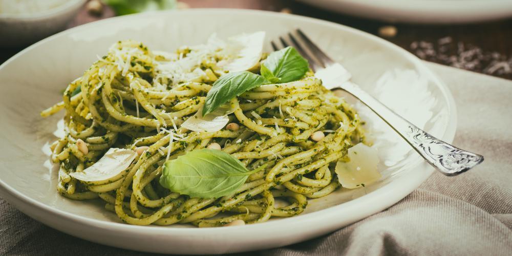 Βράζετε τα ζυμαρικά με λίγο ελαιόλαδο στο νερό και τα σουρώνετε. Παράλληλα, πολτοποιείτε στο μπλέντερ τα φύλλα του βασιλικού, τα οποία έχετε πλύνει και στεγνώσει καλά, το κουκουνάρι, που προηγουμένως έχετε καβουρντίσει ελαφρά, το σκόρδο, το λάδι, το αλάτι και το πιπέρι. Στη συνέχεια, ρίχνετε στο μίγμα την παρμεζάνα. Περιχύνετε τα ζυμαρικά με τη σάλτσα pesto και σερβίρετε.