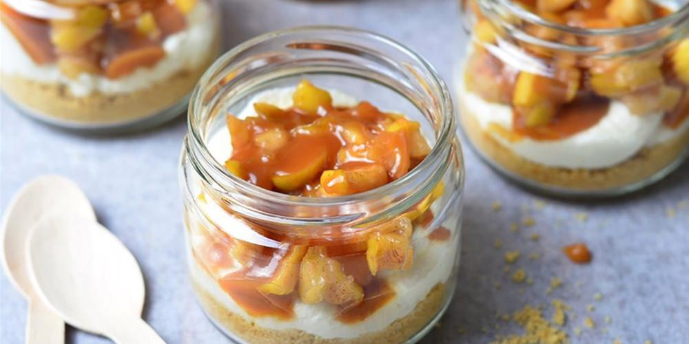 Βάζετε στο ψυγείο για 20 λεπτά. Στη συνέχεια βάζετε σε κάθε ποτήρι 2 κ.σ. γιαούρτι, από πάνω 2 κ.σ. μήλα με σάλτσα καραμέλας και σερβίρετε.