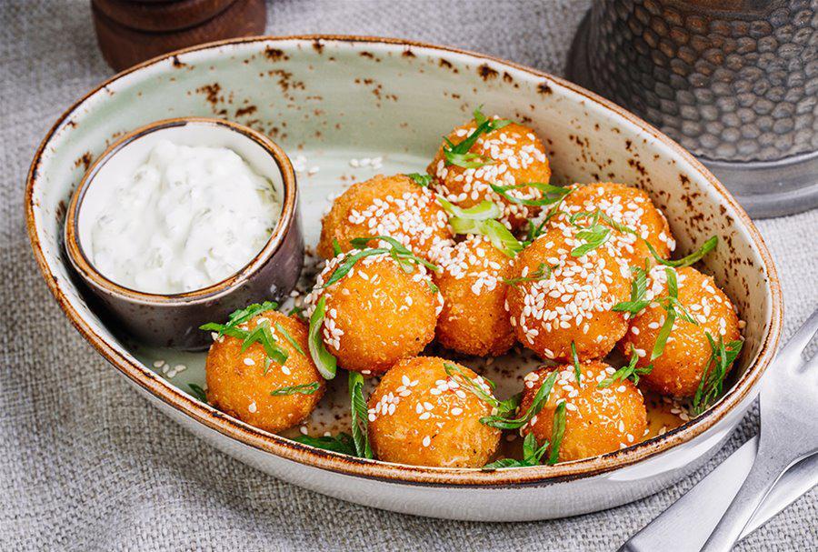 Παίρνετε 2 κ.σ. από το μείγμα και πλάθετε σε μπαλάκια στο μέγεθος ενός καρυδιού, 20-25 περίπου τεμάχια. Βουτάτε στο μπολ με το μείγμα της φρυγανιάς και ρολάρετε ώστε το μείγμα να πάει παντού και να καλυφτεί καλά όλη η επιφάνεια. Τοποθετείτε τις μπάλες τυριού σε μία πιατέλα και βάζετε στο ψυγείο για 20 λεπτά.
