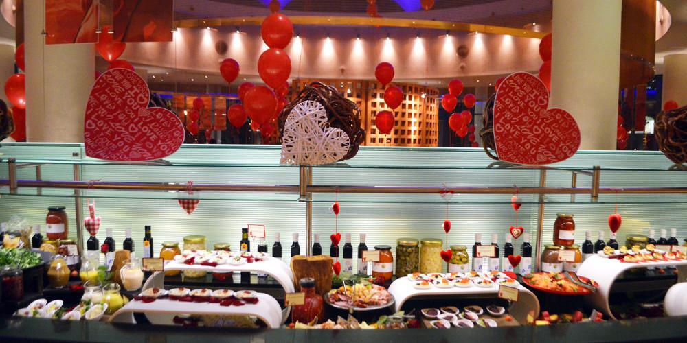 Στις 14 Φεβρουαρίου, ο εντυπωσιακός μπουφές του «Βυζαντινού» υποδέχεται τους ερωτευμένους με πλήθος γευστικών προτάσεων, όπως στρείδια, γαρίδες με κάρυ, σούσι, αλλά και Rib-Eye με τα συνοδευτικά του, ραβιόλι από παντζάρι με γέμιση καβούρι, σολομό με σος chardonnay, μοσχαρίσια ταλιάτα, ζυμαρικά Alfredo που ετοιμάζονται μπροστά σας.