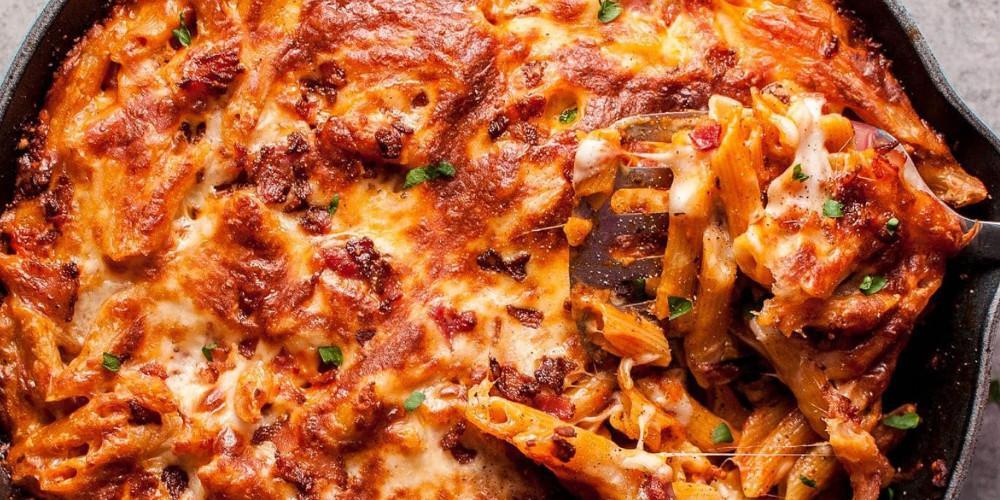Απλώστε τα υπόλοιπα μακαρόνια και τα υπόλοιπα τυριά. Καλύψτε με αλουμινόχαρτο και ψήστε για 20-25 λεπτά μέχρι να ψηθούν τα τυριά. Γαρνίρετε με βασιλικό.