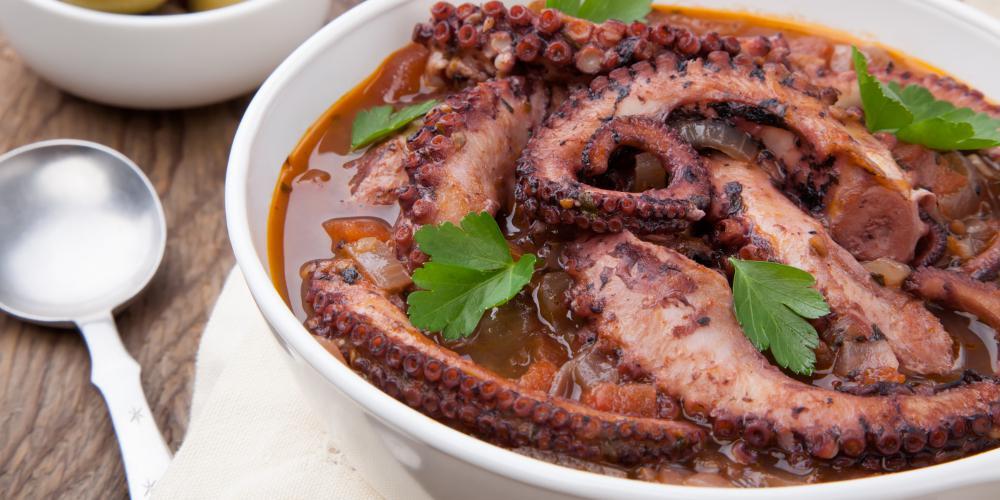 Καθαρίζετε, πλένετε και βράζετε το χταπόδι σε σιγανή φωτιά με ελάχιστο νερό και το ανακατεύετε συχνά. Αφού βράσει, κόβετε το κάθε πλοκάμι του σε δύο ή τρία κομμάτια. Καθαρίζετε τα σκόρδα και τα κρεμμύδια και τα πλένετε.