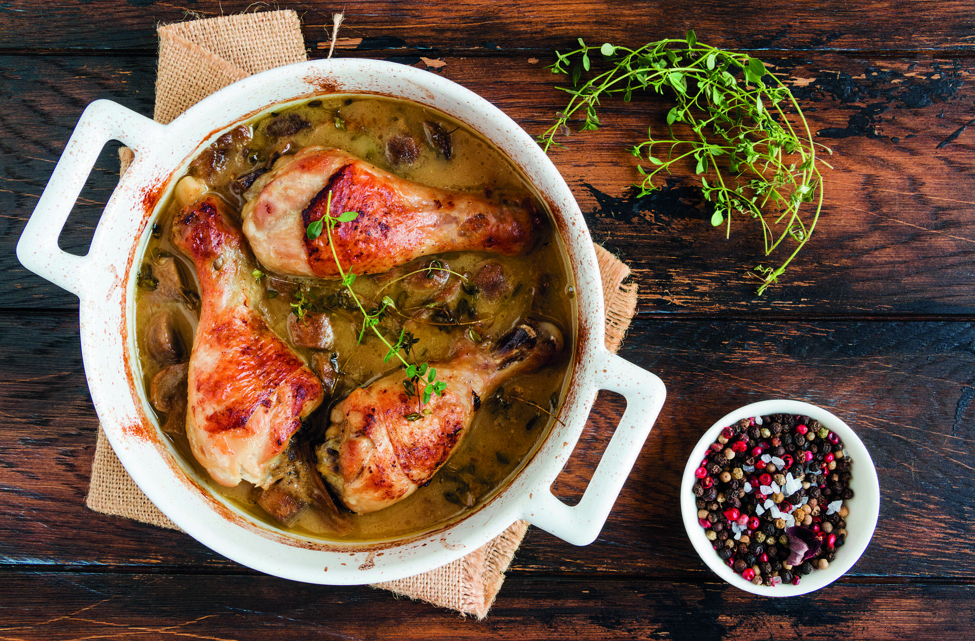 Στον πάγκο εργασίας και σε μια πιατέλα βάζετε τα κομμένα μπουτάκια και τα αλατοπιπερώνετε καλά. Τα αλευρώνετε ελαφρώς. Σε μια χαμηλή φαρδιά κατσαρόλα βάζετε το ελαιόλαδο και, όταν πάρει θερμοκρασία, βάζετε τα μπουτάκια του κοτόπουλου (κομμένα στα δύο) και τα σοτάρετε για 5 λεπτά σε μέτρια φωτιά. Οταν πάρουν χρώμα, προσθέτετε το κρεμμύδι και το σκόρδο και σοτάρετε για άλλα 3 λεπτά. Στη συνέχεια προσθέτετε το θυμάρι και σβήνετε με το λεμόνι και το κρασί. Μετά ρίχνετε το νερό με τον κύβο κοτόπουλου.
